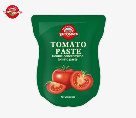 The 56g stand-up sachet of tomato paste boasts convenient packaging options, typically crafted from either plastic or aluminum foil, ensuring superior sealing and resistance to moisture, thereby preserving freshness.